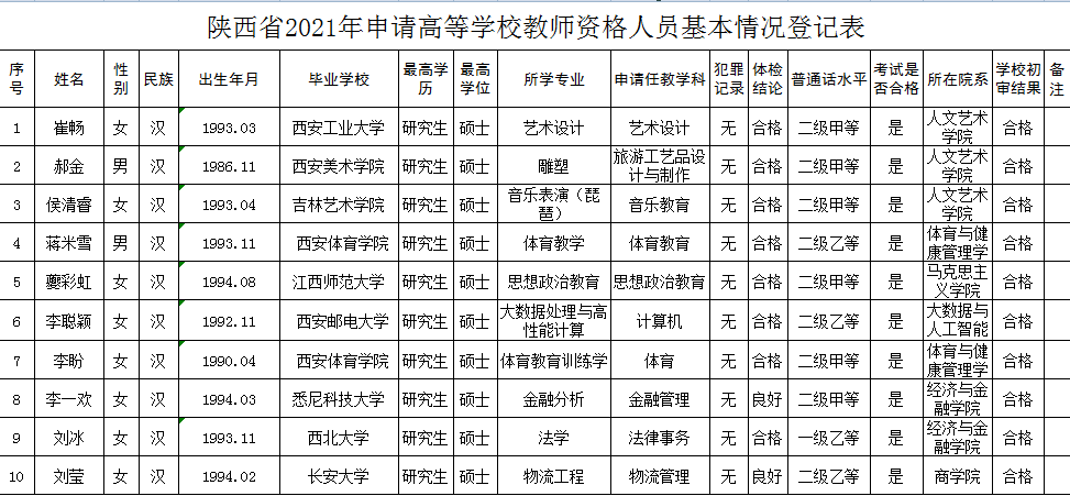 按照省教育厅《关于做好2021年全省高等学校教师资格专业技能考试与认定工作的通知》(陕教师办〔2021〕7号)文件要求,经过资格审查、岗前培训考试、体检,现将2021年申请高等学校教师资格人员基本情况予以公示。